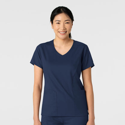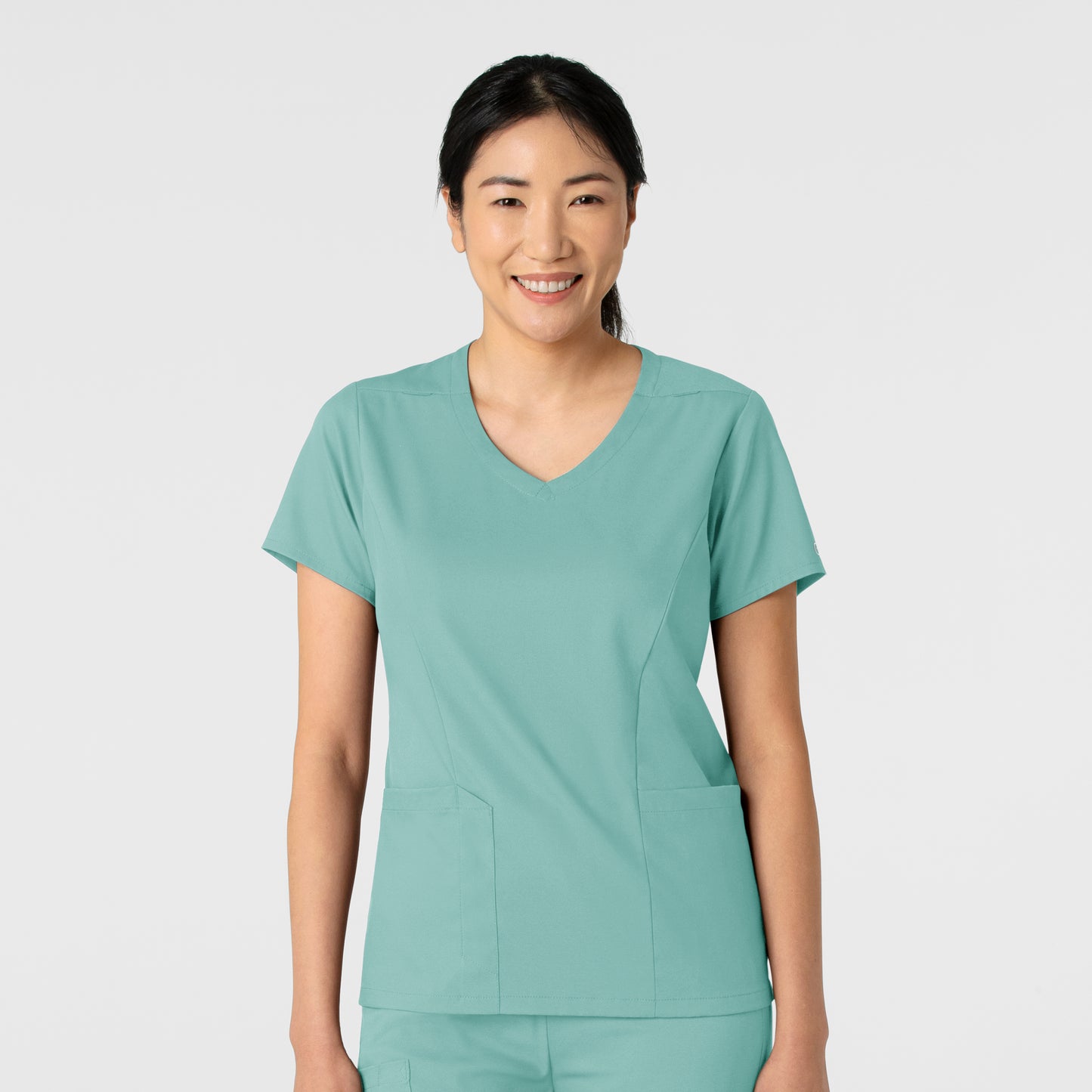 Stay focused through busy shifts and back-to-back appointments in this women's V-neck scrub top. Designed with a classic neckline, an easy drape, and purposeful pockets, it delivers simple comfort and streamlined efficiency that help your day go smoothly. Two top-loading pockets keep small must-haves right where you need them while dedicating separate compartments to your pen on one side and your phone on the other (a convenient combination). The hem curves gently with clean, modern lines to give you a look that will become your new favorite to wear to work. The stretchy, soft fabric is sustainably made and fits your frame just right—not too tight, not too loose. A loop on each shoulder keeps your badge handy, letting you decide which side works better for you. With all the function and plenty of style, this scrub top is ready to help you handle every daily task.