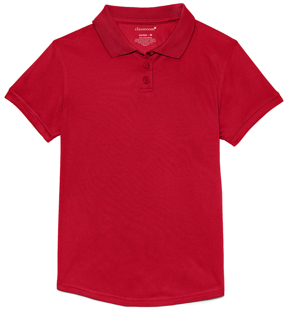 Feminine fit, stain-resistant moisture- wicking polo with matching ribbed collar and three-button placket with dyed-to-match buttons, V-notch detail on sleeves and stylish curved hemline. 100% Polyester. Imported.